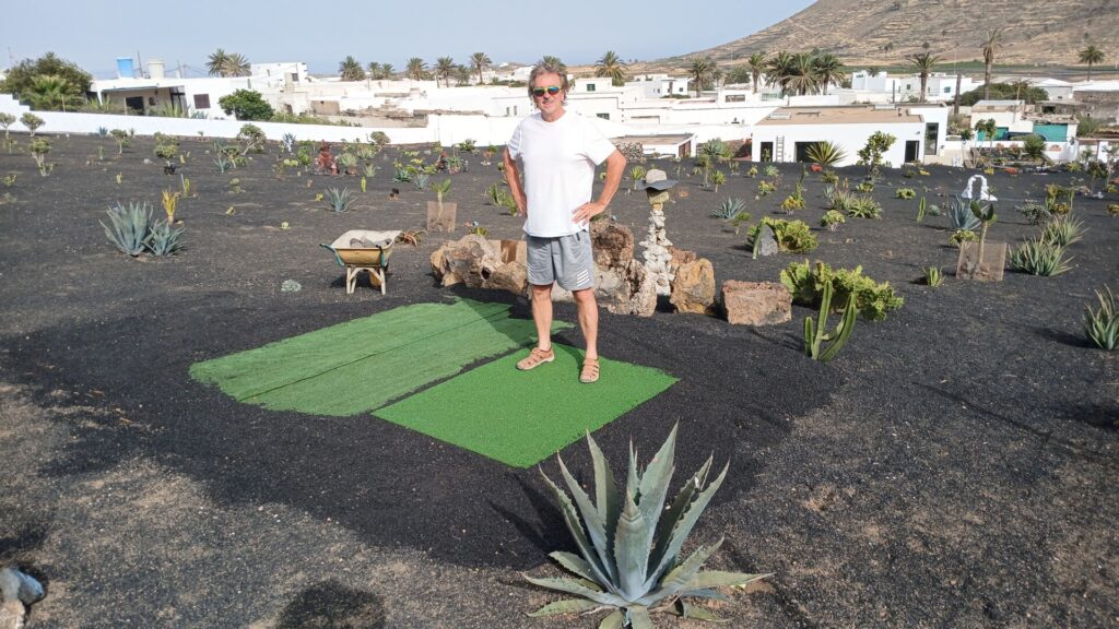 Mezitím si objednal roli umělého trávníku a speciální golfový kobereček, a jakmile dorazily, plácek jimi pokryl. Když mi druhý den chtěl své dokončené dílo hrdě předvést, našli jsme místo upraveného odpaliště jen změť umělohmotných pásů zamotanou do keře opuncie.