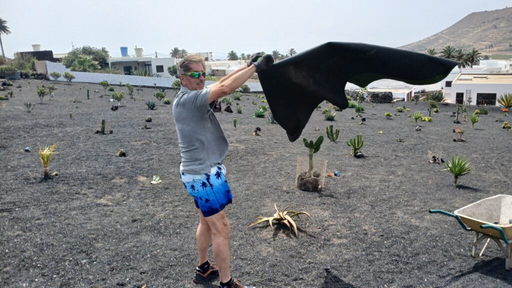 Ještě téhož odpoledne jsme cestou z pláže nabrali plné auto obřích oblázků na zatížení koberců (přesvědčeni, jak mazaně jsme na vítr vyzráli 🤣). Toto řešení, které nás ve 30°C stálo celkem dost sil, se hned další den ukázalo jako úplně na ….., prostě k ničemu.